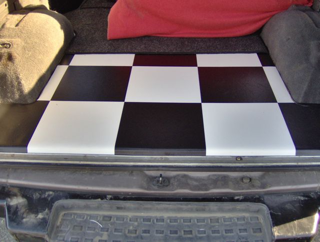 I replaced the carpet in the back of Hazel today and thought some others might be interested in a few pics of my little project. I was planning to use thin plywood with glue on linoleum, but found this funky lino-like stuff that doesn't want to be glued down so I laid out some felt and this stuff over-top. Easier to clean and new. Works for me. Now about that bed set-up...