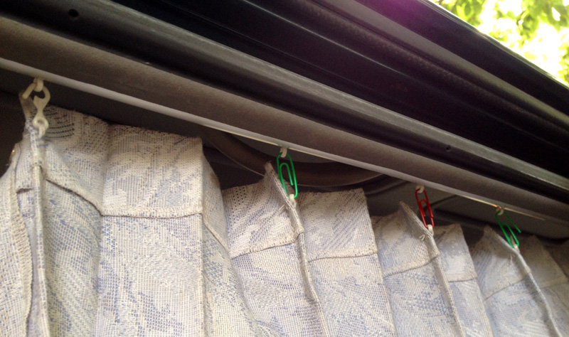 The plastic curtain holders in my L400 keep snapping on me and this seemingly little problem has stumped me for awhile. But today I came up with using metal paperclips, which are just the right length, and they're working great! You could find matching white/grey colors or use whatever you have laying around (my case). Hope this helps somebody!