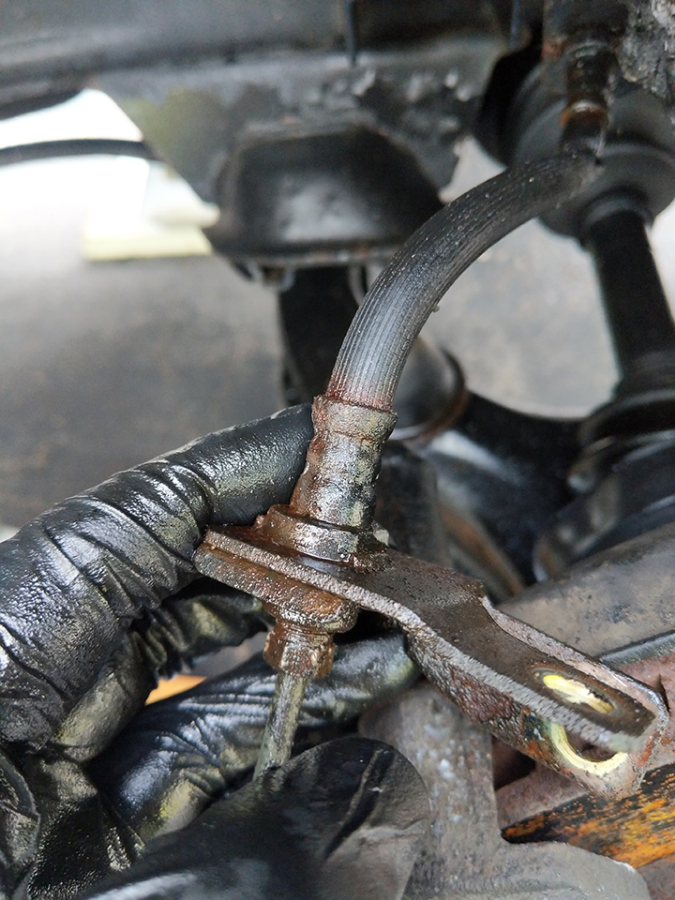 The flexible front brake hose is in two pieces that join together at the bracket halfway along its length.
