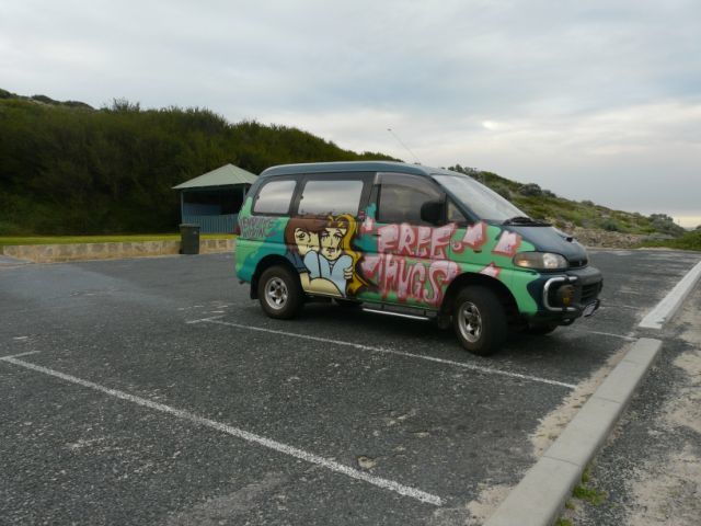 When I was in Autralia last years I saw tons of these painted rented vans. It's a pretty cool gig! Whoever is doing it seems to buy these older van, mostly Toyota, give them a funky paint job and rent them out. People (lot's by surfing spots) rent them and live/travel in them. It's a good concept! Haven't seen any painted Delica...