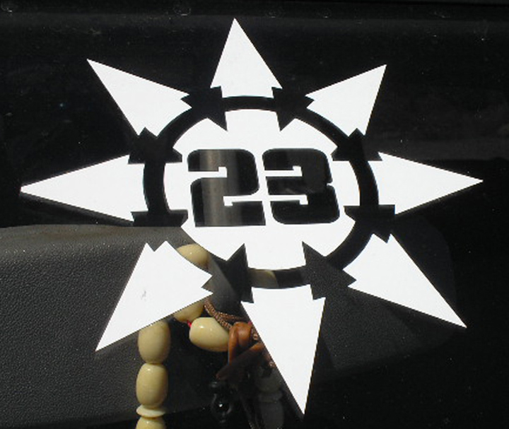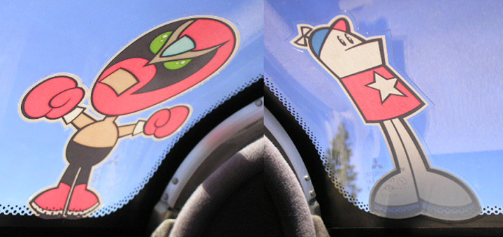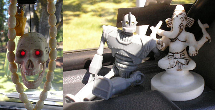 windshield middle top -- 23 chaos star passenger side column -- mitsumaple passenger side back window -- Live to Surf (a deceiving sticker... I've never surfed and Ruby hasn't been in the water in over two years, though she does own a hot pink squashtail and a wetsuit... we dream though, hence the sticker...) back window -- there's a KONA sticker on the mirror that's a lil difficult to see, lower left hand corner a band sticker for Aussie group The Beautiful Girls (they're like a kinder, gentler Jack Johnson) and upper right a Dave Matthews Firedancer sticker (Ruby loves her some Dave, all the ladies do) and in the middle a Cthulhu sticker of me own design, cuz yo! I gots ta represent R'lyeh. drivers side back window -- Soundwave 08 sticker, music festival up in Ucluelet we went to this summer... we like the slogan and the VW is a nice homage... inside back crystal-lite roof -- the ambassadors of Free Country USA... Strong Bad and the Homestar Runner! hangin from the rear view & dashboard, right side -- we figure as long as yer piloting several tons of metal, glass and flammable liquids at high speed, it's wise to have some kinda death fetish in sight to offset the possibility of catastrophe... also, the eyes light up when you pull the skull down on it's string... useful as a magic-8-ball style divination device! On the right, Juniper's spiritual allies, the Iron Giant and Ganesh... we feel it helps to have the Opener of the Way present in the vehicle. Clears traffic, smooths roads. Yeah. I feed it candy. That's it! All marks of identification are out there now, in the community! Big ups to all y'all!