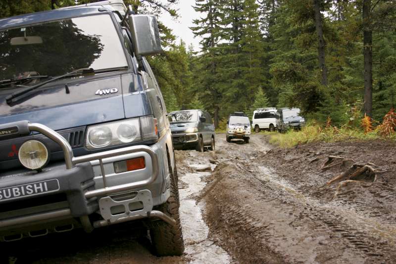 Actually, this was quite a tricky section. There were deep ruts on one side and a good sideslope with tree roots on the other. All was coated with the slickest, muckiest mud I've seen since my days growing up near the Richmond BC dykes... Madmazda was in line to tow Delica27 back off the hump. A collective grunt and he was off without incident...