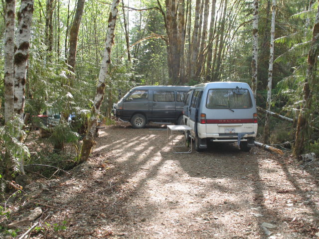 Too any one undecided about joining for the last minute - Snow creek is a beautiful spot and there'll be plenty of sites available even today. The northern site has a closed gate that's unlocked, though many small trees down around some sites. We skidded a small alder out of our campsite with our tow strap; you can see 1/3 of it just to the right of the first picture. The road to Port Alberni is in fantastic shape, taking us just 30 minutes from Snow creek to the marina in front of Port A. Tis a nice smooth'n'wide dirt highway, be careful on the narrow sections as there is active logging in the area! Tend to drive well maintained log roads like that a wee bit fast myself. Never did check the south route, but Brian said the wash out should be Delica passable; for a Main beach day trip.