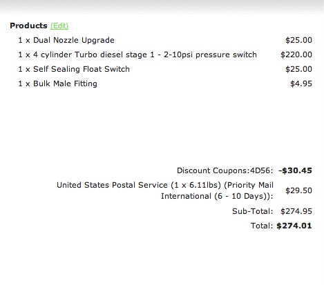guamdoc wrote: If you do go with the dual nozzle set up request 2 (DO1) Nozzles this is the combo that works on your engine anymore you'll loose power if not running alcohol. If your getting the regular kit just request a D01 and D02 nozzles.