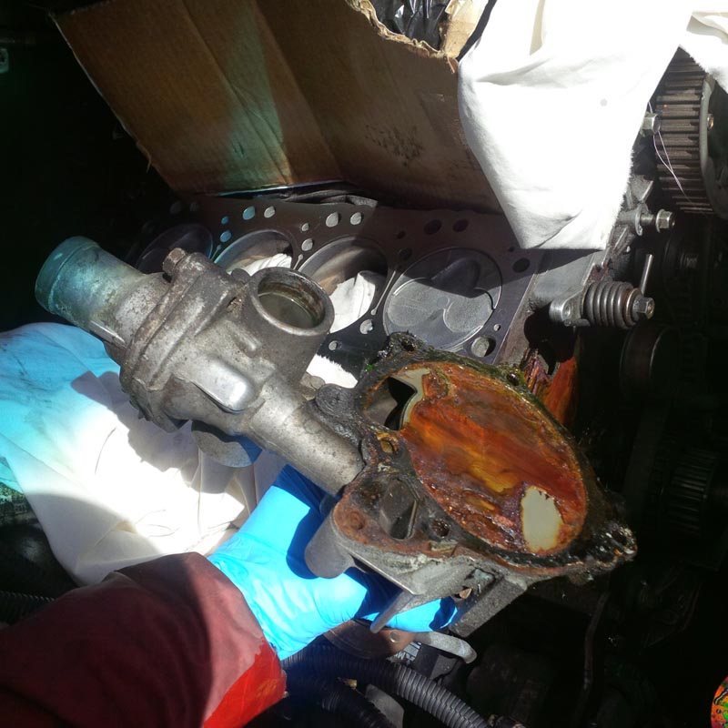 Move the inlet pipe over to the new water pump and replace the thermostat and gasket. Using an 82 degrees Mitsu part. Torque to 15 Nm or 11 ft lbs.