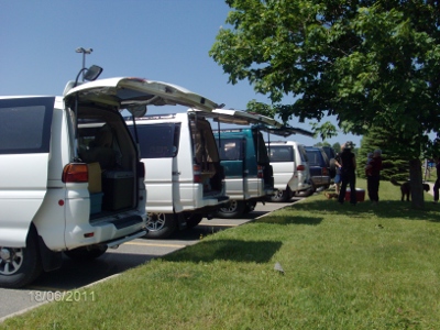 I have had my van for almost two years and in that time I have seen other Delica's but only from a distance so it was amazing to meet five other drivers and see inside their vehicles. In our town we have two L300s but we only met yesterday. Subabus and I have waved in passing but have never met in person. Well yesterday at the Muskoka meet that all changed. We were the first ones to the parking lot so we had a chance to chat and share stories of our beloved vans. She showed me the cool owners manual that came with her Delica (which I secretly coveted) and we used it to figure out what the latch thingy was on the back doors of our vans. We also discussed how to start our vans and what some of the buttons were for.