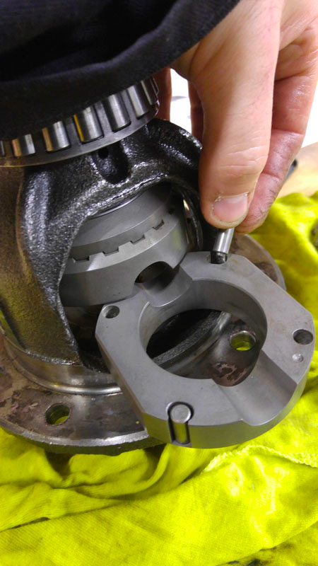 Install the cams into the diff cage. The upper one goes in first, then slide the second one in with the spacer inside.