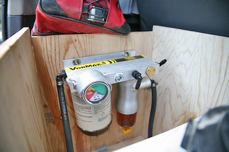Here is the Vormax filter, I have not yet hooked up the heat to it as the installation took longer than I expected. I did drill the holes so I will just have to cut some lines and add it before labor day (as suggested by plantdrive when I emailed and asked if I would be okay for summer with no heat to the filter). I think that I will use the coolant lines running to the rear heater. Has anybody done this at all?