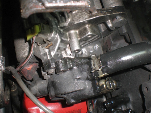 I have a 93 Delica, Exceed, 4D5 Diesel with automatic transmission with 112,000 kilometres on it, oil is Shell Rotella 15w40. Bought it a year ago with just over 90k and everything well so far. My son uses it in La Ronge, where it has not gone above freezing since October. The one day it did go above freezing, about 2 weeks ago, he noticed an oil leak. I then brought it down to Saskatoon on a trailer, garaged it and raised up the front end to have a look see. Photos 38 and 40 are taken directly below what I believe is the oil pump which pumps through the oil filter. The pump is attached to the back end of the alternator. The hole in photo 38 is covered in photo 40 by the screw, pointed to by the head of the Phillips screwdriver