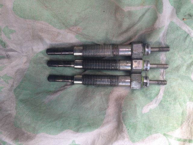 These are the tops of the glow plugs (I've already removed the wiring and plate (the bus bar) on this photo). Here's the photo with the plate and wiring: The first glow plug I pulled out. There's some oil on it which bothers me... is this normal? (it doesn't seem like it should be) Does it suggest an oil pressure problem? Here are three of the four after cleaning with a rag (I replaced the first one, then realized I should compare all four): *****