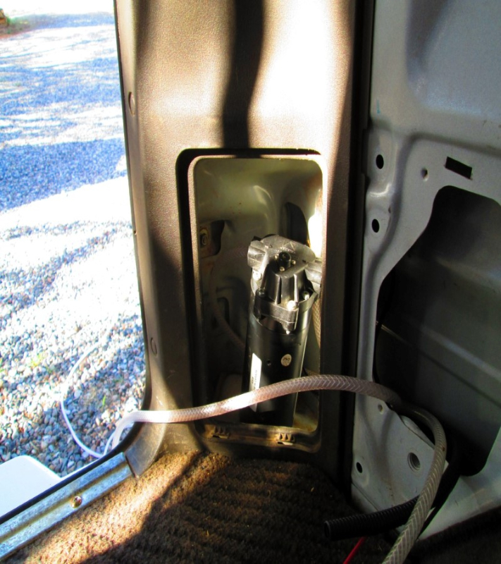 I started with an industrial 24V DC pump for reasons of power use, and water flow, one of the main reasons I did not use a shurflo for my shower. It came from a junked floor cleaner that would be used to clean the floor in a grocery store. Run on 12V, rather than 24V it moves 6 liters in 5 min. which I found to be about right. With lower flow, it eases both water use and propane use enormously. I used 1/4" line which plugged right into the pump without any fittings, nice! The trick to making low flower showers work is the showerhead, IMHO. I searched all home supply stores with reason, and bought 4 to test. The best one was the cheapest: $3.99 at HD. Nice rainshower effect, my wife was thrilled. The pump was wired through a fuse, of course, and pulls from the load side of my solar controller. I have a morningstar, which has a built-in ammeter, and I run all my coolers, chargers, and the pump off of it, so I have an idea of how much power everything uses. It used virtually no power: .2 amps at 13V, and could not be heard. It is not a firehose however...but compared to every solar shower I have camped with over the years, it was completely joyous. I put the switch for the pump on a wired tether with another magnet, so you could pull it off the underside of the steel cooler bracket and attached it to the rear bumper so it would be within easy reach. Since there is no pressure, all hoses push-on and pull off with no clamps needed. I roll them up and stuff them into a small camping stuffsack on the passenger side. The pump fit nicely in the back passenger side corner, padded with some cut old camping pads, and is invisible.