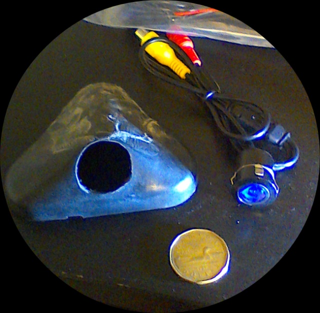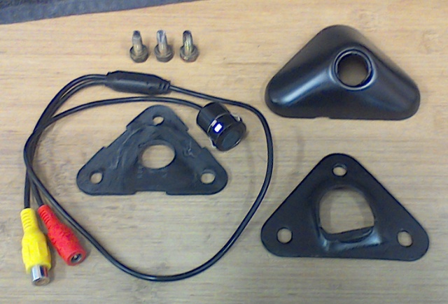 After some ebay searches I found a rear view mirror with built in LCD screen and then I bought 2 different cameras...both with IR so they can see at night. One camera was too big for the cover...I could get it to fit but the jam nut was to big so there was no way to secure it properly. The second one seen here is 2.2cm across (and 2cm deep) with a locking spring clip so it fits perfectly in the plastic cover. Now all I need to do is modify the factory mirror mounting plate, drill a hold in the rear hatch metal and pass the wires through to the LCD mirror. The LCD mirror and camera kits both come with lots of cables (25 feet total) so there is no wire splicing needed. Power for the system comes from the reverse lights. Might have to rig up the other camera and use that as a hidden dash cam. That's a mod for another day!