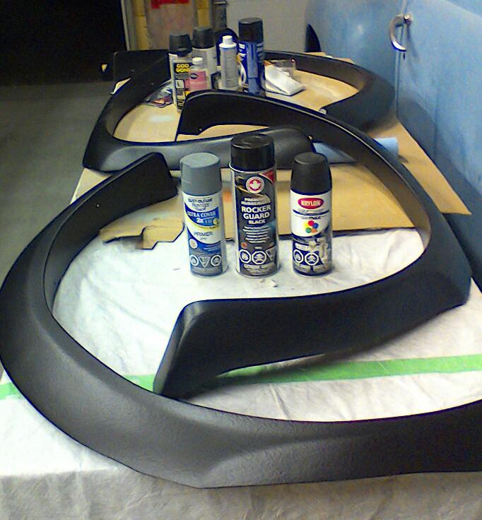 rubberized rock guard 20mins for each coat but the final color.....not done yet....trying to find replacement gasket body seal and may have found a match from Bushwacker. Need to try it first. then I will pain the satin black, glue the rubber seal and mount to the van.