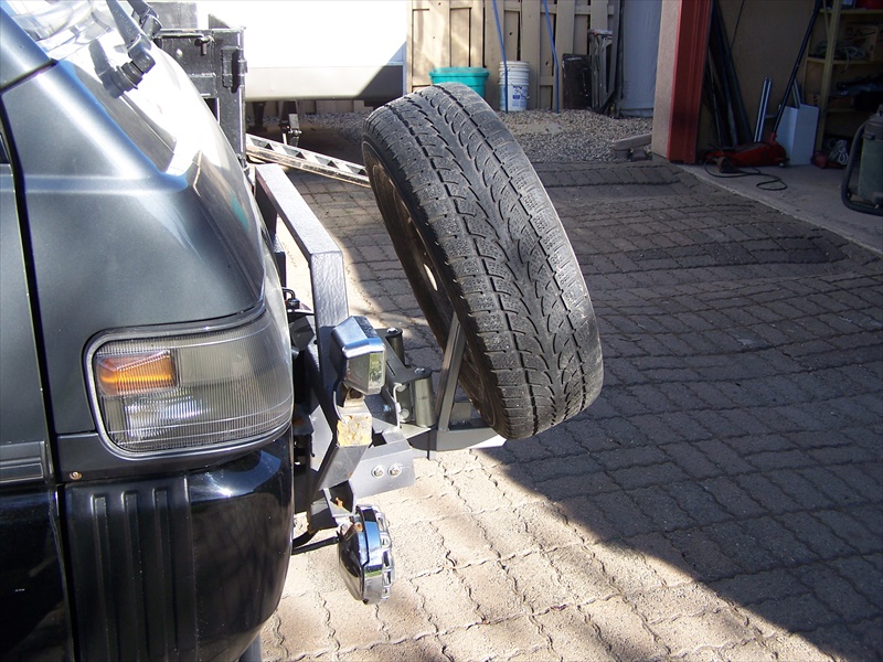 I finally finished the last phase of my winch project. I made a spare tire carrier to use the 2" receiver type hitch I installed as part of the winch. It sticks out a lot farther than I planned but the good news is I can use it on the trailer hitch @ the back.