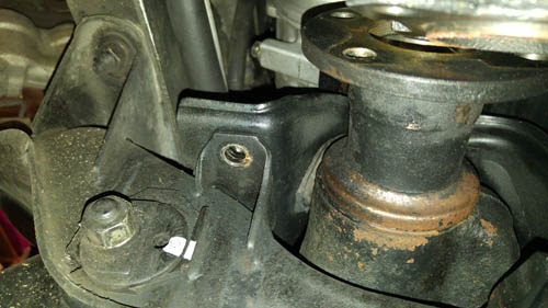 Loosen the *left side* 17mm nuts holding the rear subframe/cross member to the chassis- don’t remove them entirely, but undo them as far as they’ll go without coming off.
