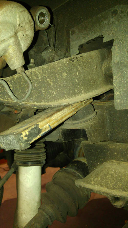 Turn the steering all the way to the right, then on the left front suspension, insert a piece of wood between the upper wishbone and the upper bump stop (rebound stop).