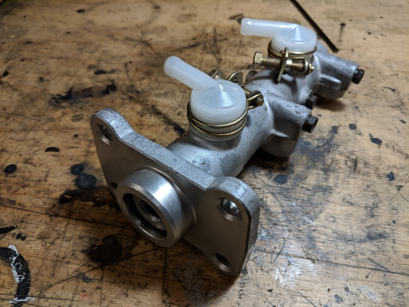 This one was an aftermarket unit, so I don't know the part number. As best I can tell, the genuine part number is MB295330. That's a 1" (25.4mm) bore master cylinder that looks the same as this one. The genuine part is made of cast iron though, I'm not confident how it would stand up to having extra holes drilled in the flange. I've also seen some aftermarket ones where the flange is thinner in the area I had to drill- which is a *really* bad idea.