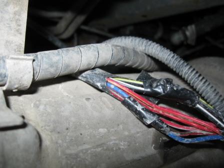 This pic shows you the two large wires (black w/ white and black w/yellow) that are spliced togther and amateurishly taped together. Ignore the other taped wires (blue and red) that are on the lower part of the pic. They were just part of the experiment