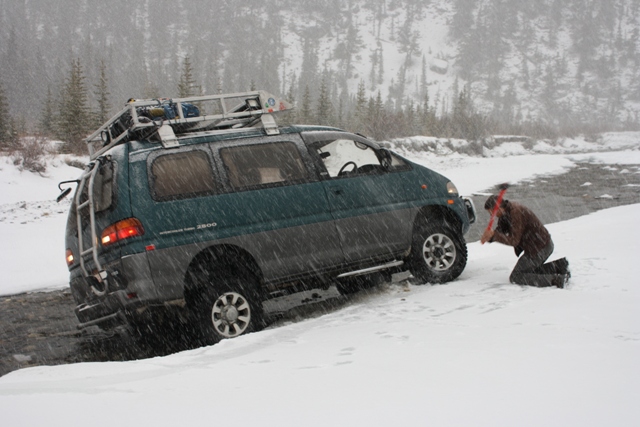 He had approached the shelf head-on but as soon as the wet front wheels hit the ice his van pivoted 90 degrees and precariously came to rest pointing down river and diagonal high-centered. What followed was the ceremonial dunking of his brand new axe into the river while retrieving it from the roof of the van and subsequent wading to re-retrieve said axe in order to try to chop away some of the shelf to get the wheels back on the ground…