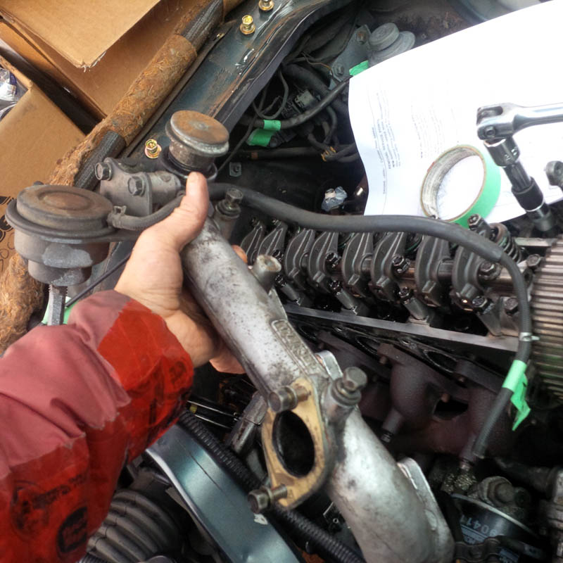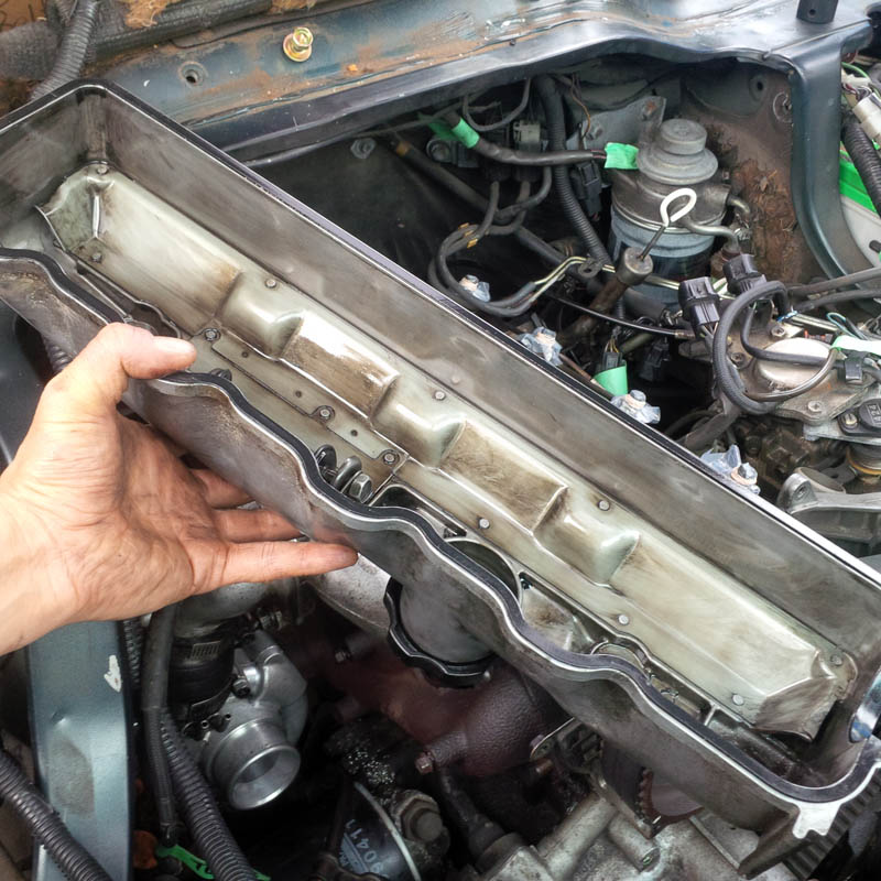 I did the same thing you are doing (sans the awesome picture diary) on my 1990 US Spec L300 gas model. Only I had to do it twice because the new head I got had the wrong length valves in it that wouldn't close so it wasn't making any compression. The LHD 2.4 litre gas model maybe seemed a lot more simple as it didn't have a turbo, and the hinged engine cover didn't need to be removed, just swung way up. Also had the extra room by Mitsubishi allowing you to unbolt the drivers seat, and the floor it was mounted to to gain more access. Excellent job with including all of these pictures! Keep up the good work. I hope I never have do what you're doing, but chances are I will at some point.