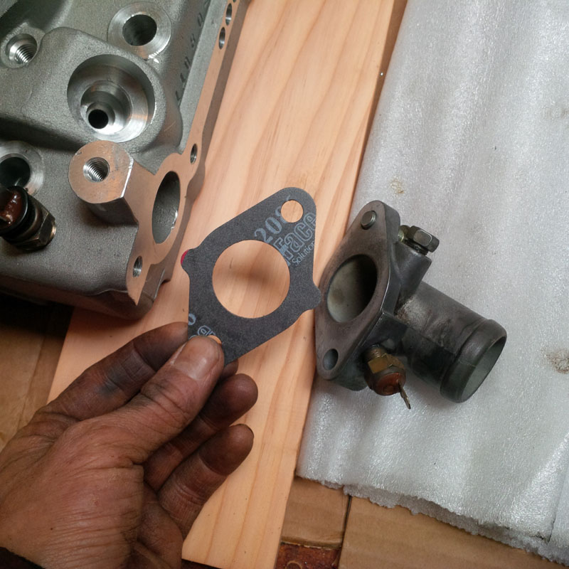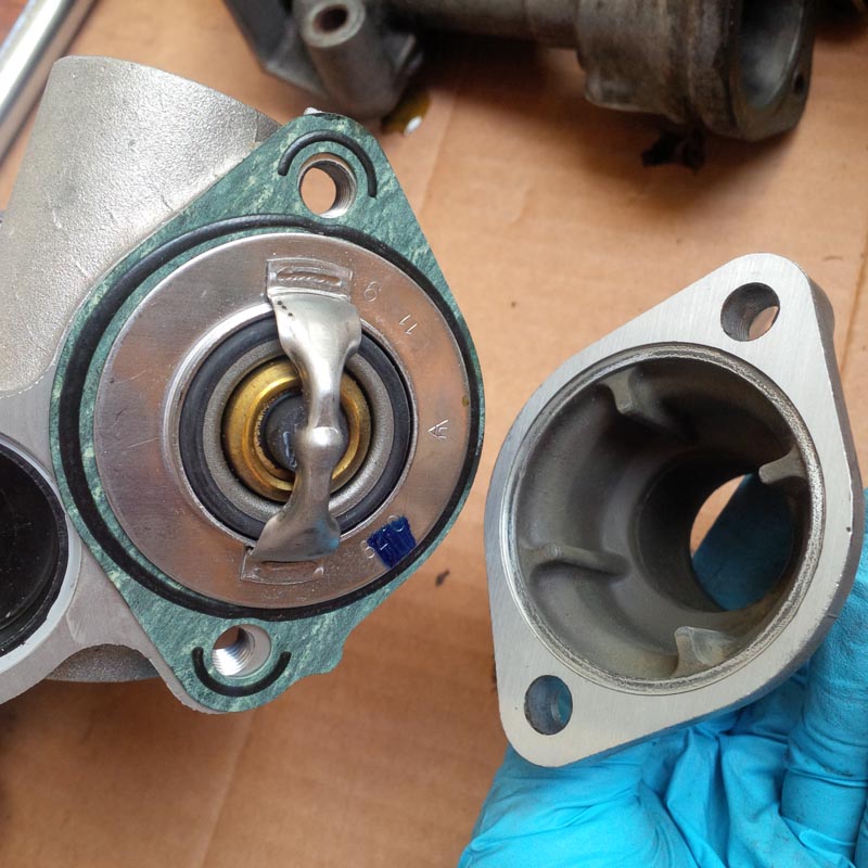 Move the inlet pipe over to the new water pump and replace the thermostat and gasket. Using an 82 degrees Mitsu part. Torque to 15 Nm or 11 ft lbs.