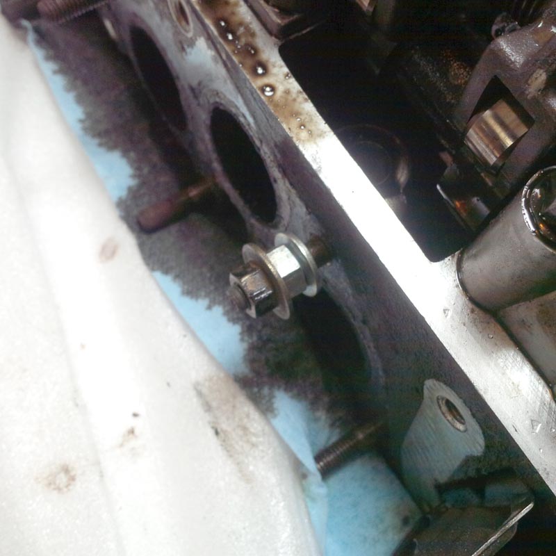 Detach the oil line from the turbo by undoing the bracket on the intake manifold and following the line to the back of the head where there is a hard to get at connector. I got in there from underneath. As you can see from the photo, the infamous half moon seal on the back of the valve cover was leaking oil back there. This will get fixed on reassembly.