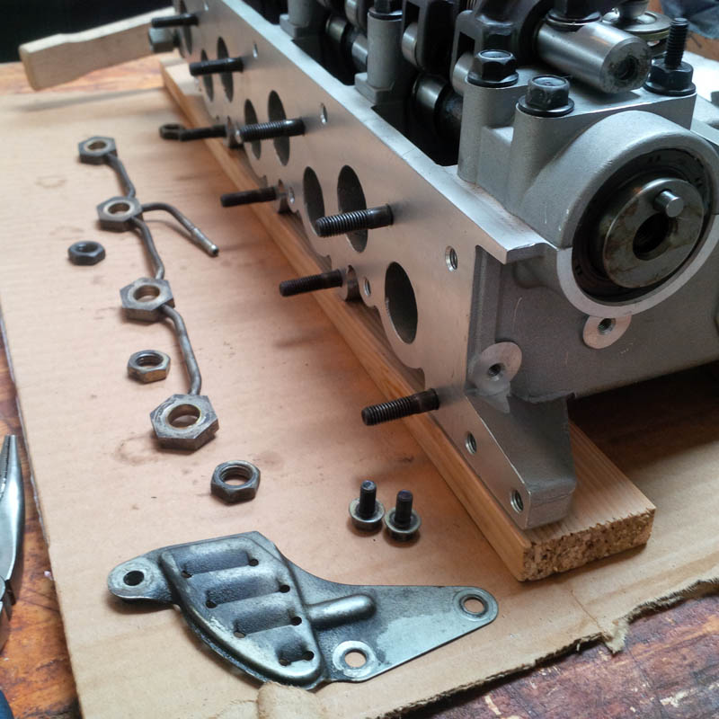 The new head and the old head are laid out on the bench and I've started to transfer all the bits and pieces. If you've got a 1993 or earlier head with protruding valves like I do, then raise up the head on blocks of wood to avoid damaging the valves.