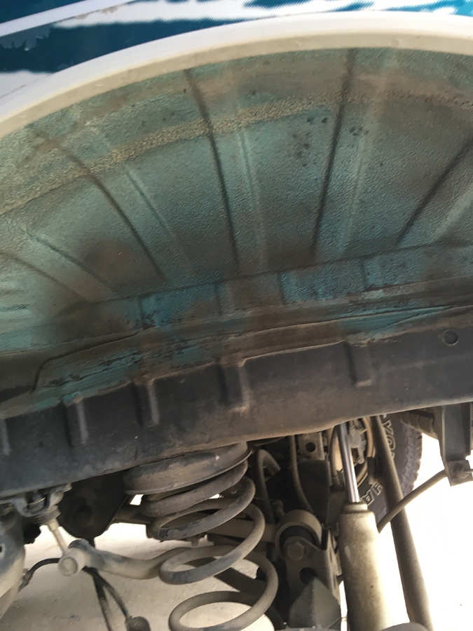 Suspecting it has run down the vertical panels, I removed the wheels and fender lining to reveal that it had, in fact, collected under the tray and even eaten a nickel-sized hole in the metal. Classic.