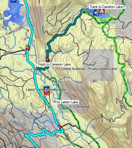 Cariboo lake is another of the lakes and Rec Sites along the Whatshan – Mosquito – Fostall FSR's between Needles and Galena bay south of Revelstoke. I did not camp here merely observed for future reference. It looks like a nice area with flat camp sites and easy boat launching. The lake reportedly has rainbow trout and brook trout though I can't confirm either. I also heard from campers @ other lakes that the mosquitoes can be unbearable early in the year. I approached Cariboo lake from the south from Mosquito FSR. This was a monumental climb with several grades well over 20%. I was in first gear a lot of the time and even had to stop once to let the van cool down. I have added a copy of the Route from Mosquito as well as a portion of the road grade. The little guy on the route is the location marked on the elevation picture. The road to the north, which is a more gradual climb, joins up with the Mosquito FSR .