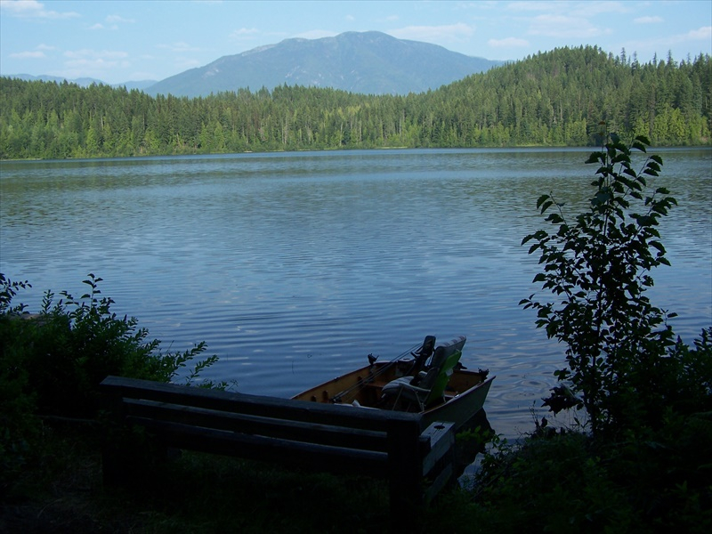 The road north from Mosquito Lake is only an active logging until the turn to Fostall FSR where they take the logs down to Arrow Lake. The road north from there I think is called Shelter Bay FSR. It is still good but not maintained as well. The side road to Catherine is about 1.5 km and the sign for the site is @ the site of course. Catherine lake is an amazing lake. It is quite small but very deep with the middle section over 100 feet. The dropoffs from shore are almost vertical in some areas and other sections are very shallow. I arrived on a Sunday afternoon to a full campground with day fishers parked everywhere. This was a real surprise compared to the other sites. Luckily by 5 all were gone and the only guy I saw on Monday was the fire warden making sure nobody had a campfire. I talked to one of the campers from Revelstoke and he indicated this was a very popular site for people from Revelstoke as well as the other side of Arrow lake. They all come for the large fish. The fish I caught was a nice size and strong enough to take over 30 minutes to bring in. This is definitely a top 10 lake.