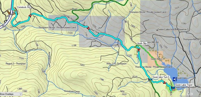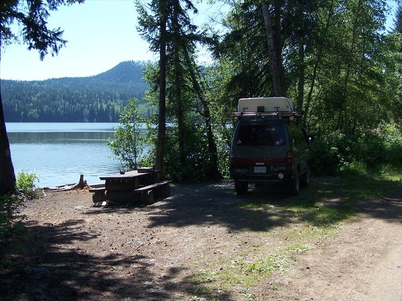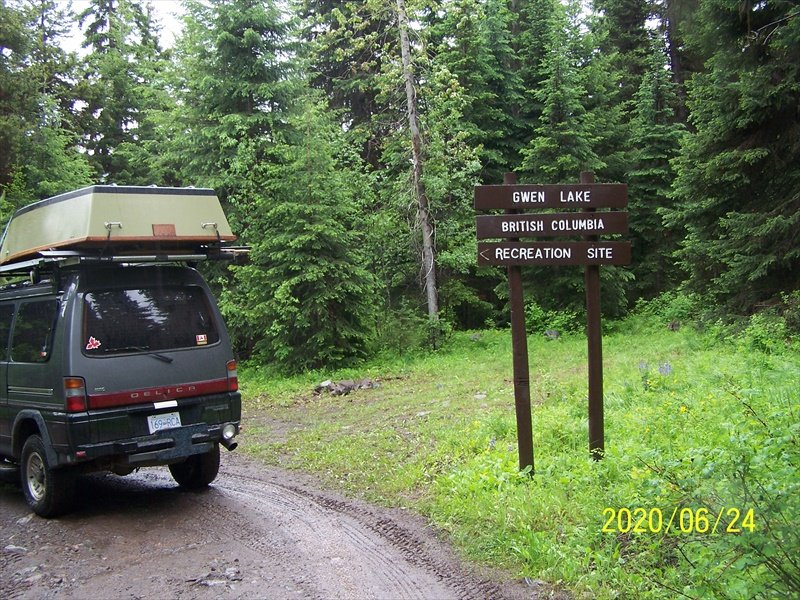 I finally get to report on a new to me Rec Site. This last week I spent 3 days @ Gwen lake. Gwen is located east of the Coquihalla using the Comstock exit south of Merritt. The lake is about 6.5 km from the highway with less than a km. to challenge your van. The road has a few water holes but the last decent into the site is quite washed out and requires a bit of thought as to the best path. It can't be that bad though as I talked to a guy who witnessed a mini van come an go during his stay @ the site. Despite the road, traffic was an everyday occurrence and I found quite a number of people from the lower mainland use it for day fishing. I also found out that a much easier route is available to a site @ the north end of the lake. It is not an official Rec Site but a number of people were camped there and @ least tables were provided. The route to that site is shown on the map starting @ the North site dot and following the green line. It starts about the 4.5 km marker.