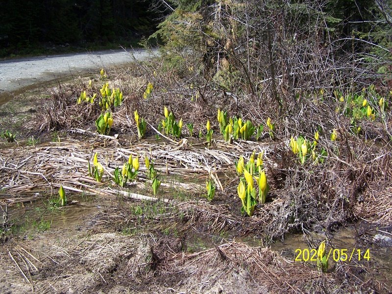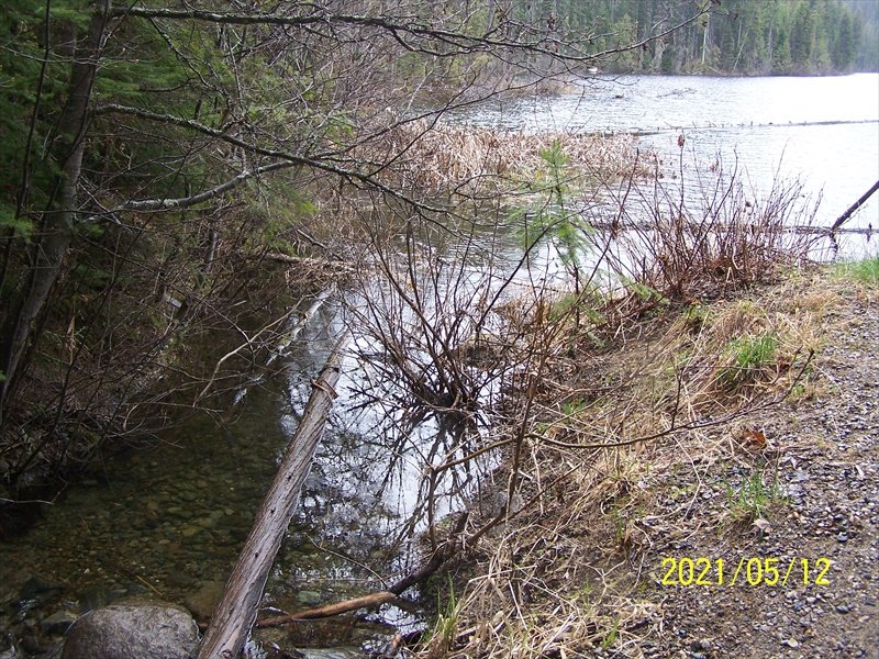 Lolo Lake is a small, deep lake west of Clearwater. It is only about 10 km from Clearwater and can be reached by any type of vehicle. I thought I'd have the lake to myself as the forecast wasn't to good and after all it was quite early in the season. I was WRONG. I was the only one camping but I had several visitors each a day starting off with 2 ladies in a BMW SUV. The visitors continued for the 3 days I was there and even though the fishing wasn't great I learned a lot about the lake and it's likely hood to be busy. I also checked out the fish in the spawning channel adjacent to the boat launch. I saw several fish in the 15” plus range. It seems everyone in Clearwater visits the lake sometime during the year so you can have it all to yourself or can't even find a place to park. The site has 5 places to camp. 2 are on the lake and 3 larger sites are up in a gravel area. I chose the later as the wind off the lake was way to cold this time of year. This time of year a 'flower' seems to be growing in all areas that have water. I took a picture of it so maybe someone can tell me what it is.