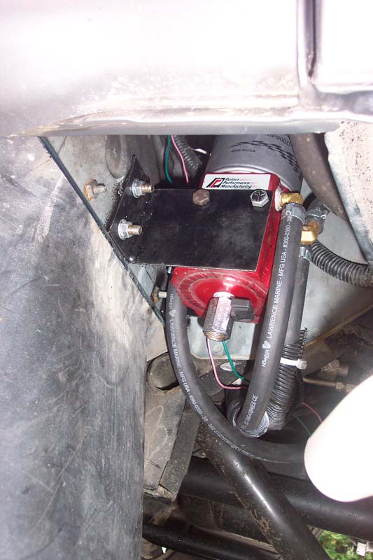 This shows the general engine compartment. Looks probably like nothing special untill you look closely. Just behind the battery off to the left of the pic you can see the bits and pieces sticking out. Also, I drilled a hole in the head right by where the factory temp sending unit is and tapped it so I could install the temp sensor for the vo controller. You can also just make out the small return line from the #3 injector to the banjo fitting on the injection pump. I found a new banjo fitting that had a larger diameter hose fitting so I could run 3/8 line, and modded the fitting to work.