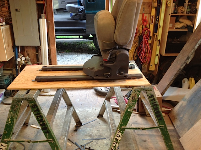 I started by skrewing the seats to a piece of plywood so I could test without crawling in the van and it made it easier to do the cutting and assembly.