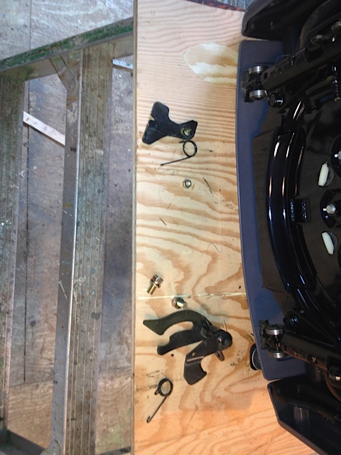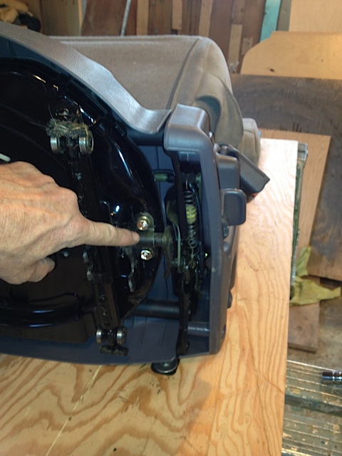 Now I can lift the seats in and out with no tools and leave the tracks in place. Also removed two brackets that prevent the seats from swivelling in the forward position and the seat from moving all the way forward with the seat in the down position. These are two "safety features" that I don't need.