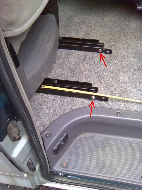 1. cut out the carpet and underlay approx 10 inches in length by 2 inches width behind both sliders. Just enough so that the seat can be pulled out of the channel guide. You'll have to unbolt the retaining pin at the end (red arrows below)
