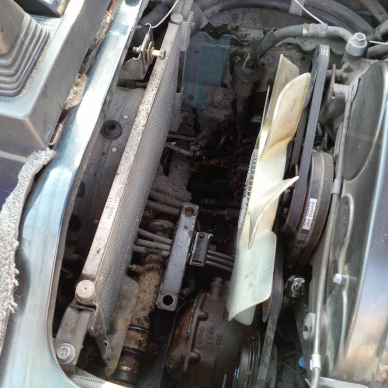 And once that's done, pull the radiator upward, carefully so you don't damage the fins. Nice to have a helper for this. You are left with an engine compartment that looks like this.