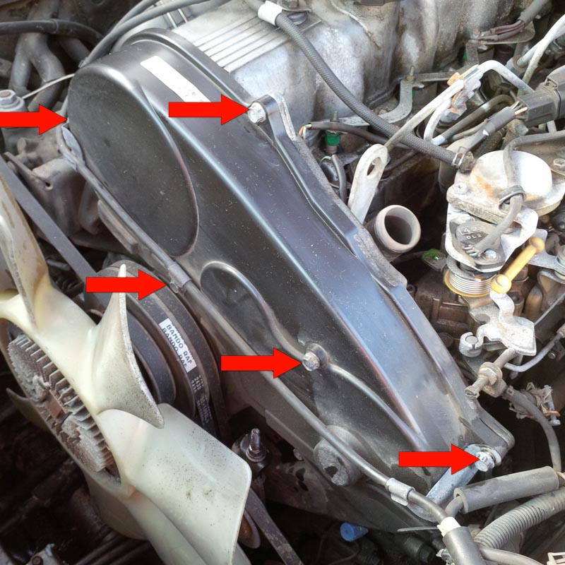 Next I removed the radiator hose on the drivers side. It's difficult to access the bottom of the hose, so I just detached the top. Also, remove the rest of the fan shroud by undoing 4 bolts. Two are shown with arrows and two are hidden and are difficult to access as they are deep in there. Use a socket extension or long sockets.