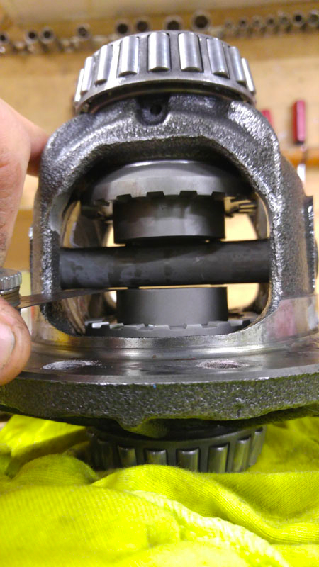 Install the side gears and spacers with new shims, then the cross shaft. Check the clearance between the cross shaft and the spacer- it should be 0.006 - 0.020", and ideally even on each side. (Mine are 0.012"). Lokka say not to worry too much about these clearances, the important one is the inter-cam clearance which we measure later.