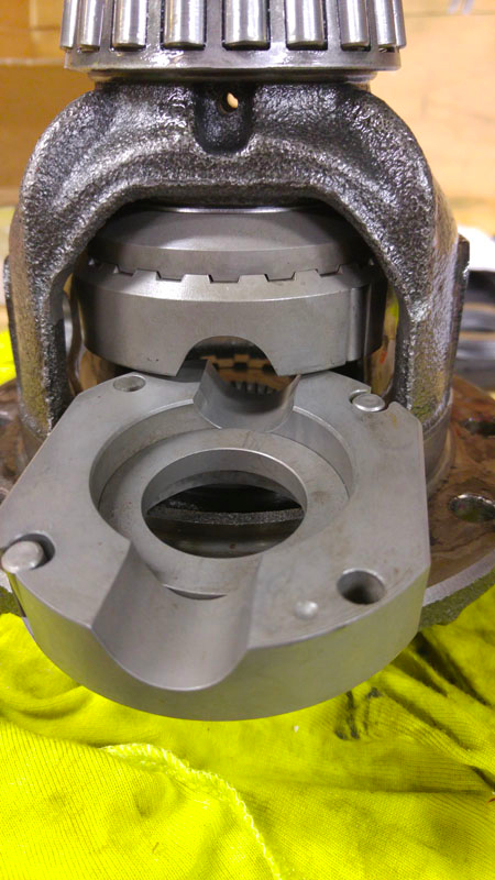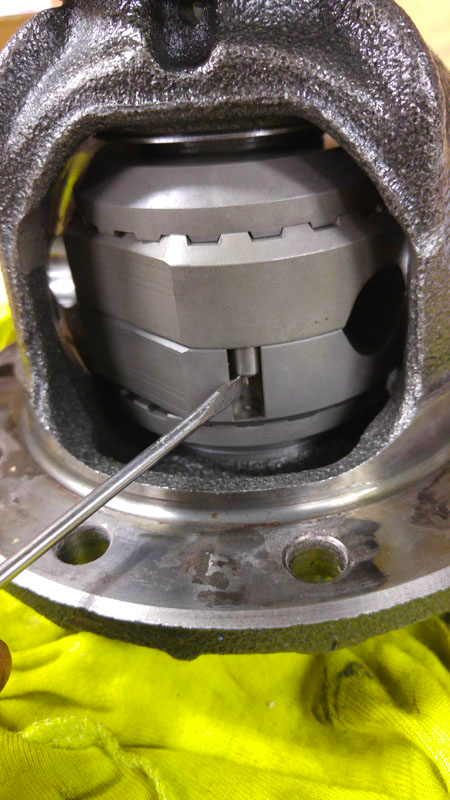 Install the cams into the diff cage. The upper one goes in first, then slide the second one in with the spacer inside.