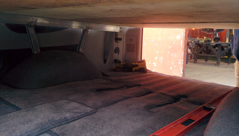 Finally, I used the stock bolts for the 3rd row seat positions to attach the legs to the vehicle at those standard engineered points. By the way, I forgot to mention that the passenger side box rail is obviously cut shorter than the other side so it doesn't impede the access opening from the sliding door. Nice thing about this overall approach of using the 3rd row seat attachment points to support a platform is that no alterations are necessary to the vehicle at all, and you have no legs supporting the platform underneath in the middle. More space underneath for bins etc! If you want to hold really heavy loads on top of the platform you could attach a couple of pieces of smaller dimension steel-angle attached across (just to the plywood underneath) to bolster horizontal stiffness. The combined weight of my wife and I is about 300 lbs...and we don't find it is required with 3/4 ply.