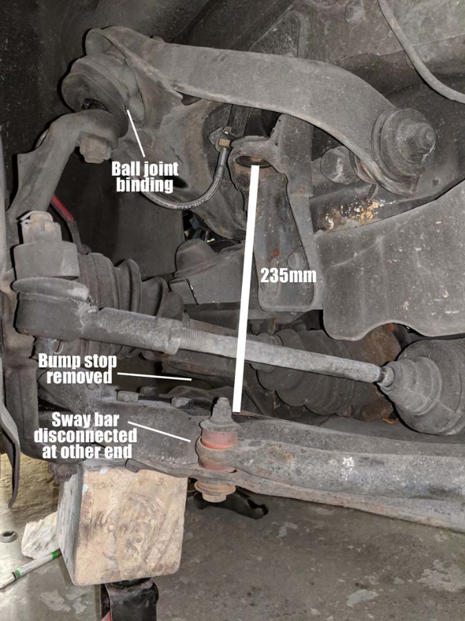 Then I removed the lower bump stop so I could see exactly how far the suspension could compress in a worst-case scenario (a split bump stop). Jacking up the suspension, I found that the suspension stops moving when the top ball joint binds, and the minimum distance from lower wishbone to lower shock mounting point was 235mm. The lower bump stop has a 2mm steel base and a 80mm bolt head welded to it (buried inside the rubber) which add up to 10mm- meaning that if the rubber were to completely fall off the bump stop, the maximum shock absorber compression would be 245mm.