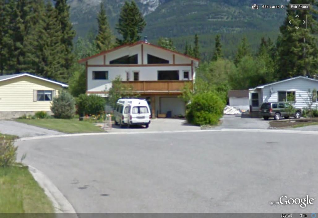 I didn't find any of the usual suspects in my neighbourhood, and Gumdrop isn't in her parking space at home. The Googlemobile must have driven by on a day I drove to work. Either that, or it may have been when I was out of town for a few days in May - the leaves on the trees and the angle of the sun are consistent with May.
