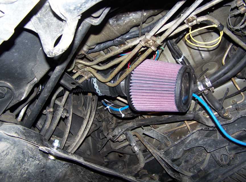 I put a K&N on mine, but left the piping into the air plenum (instead of plumbing it forward as you have), attaching the filter there in place of the can. Even leaving it back there I noticed better 'flow' although there is an increase in engine noise without the can. I think an even better set-up would be snorkel out the side with a K&N at the top: increased water-crossing capability, better intake air flow (that can is a pretty big drag on flow), and more direct access to cooler air (out in the open instead of behind the wheelwell).